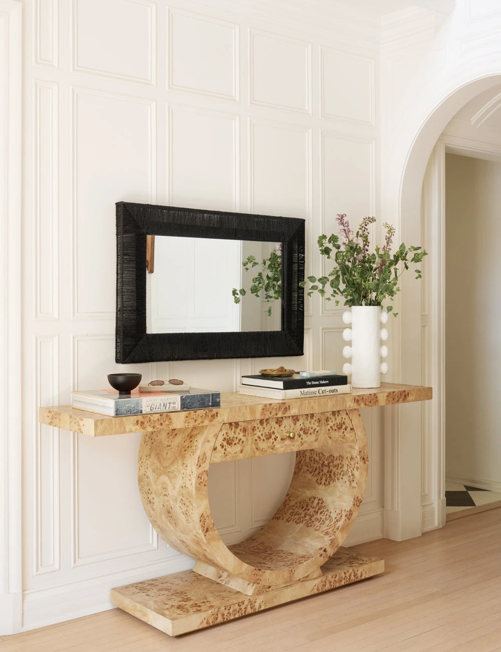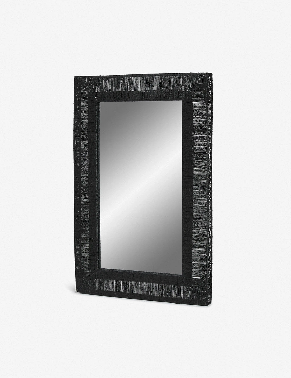 This framed mirror is a statement-making accent, combining organic appeal with a sleek black color. Twisted jute fibers are tightly woven around a light steel frame to create a textural finish. Hang this wall mirror above a sideboard, console table, or dresser in a dark finish for a monochromatic look.