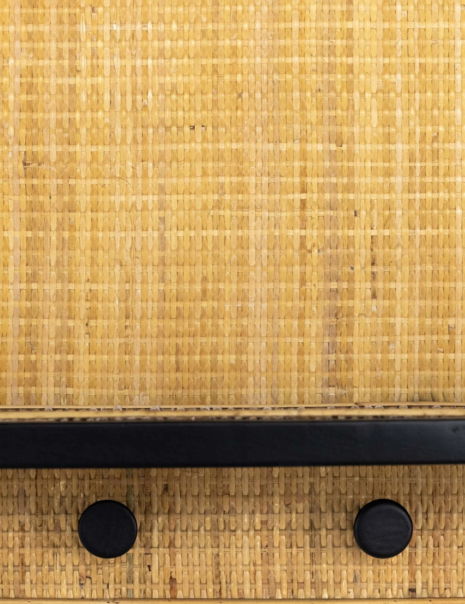 Bring a layer of natural texture into an entryway with this shelf made from black-finished Sungkai wood and woven cane paneling. This wall-mountable shelf featuring four hooks is a practical, organic touch for a functional space.