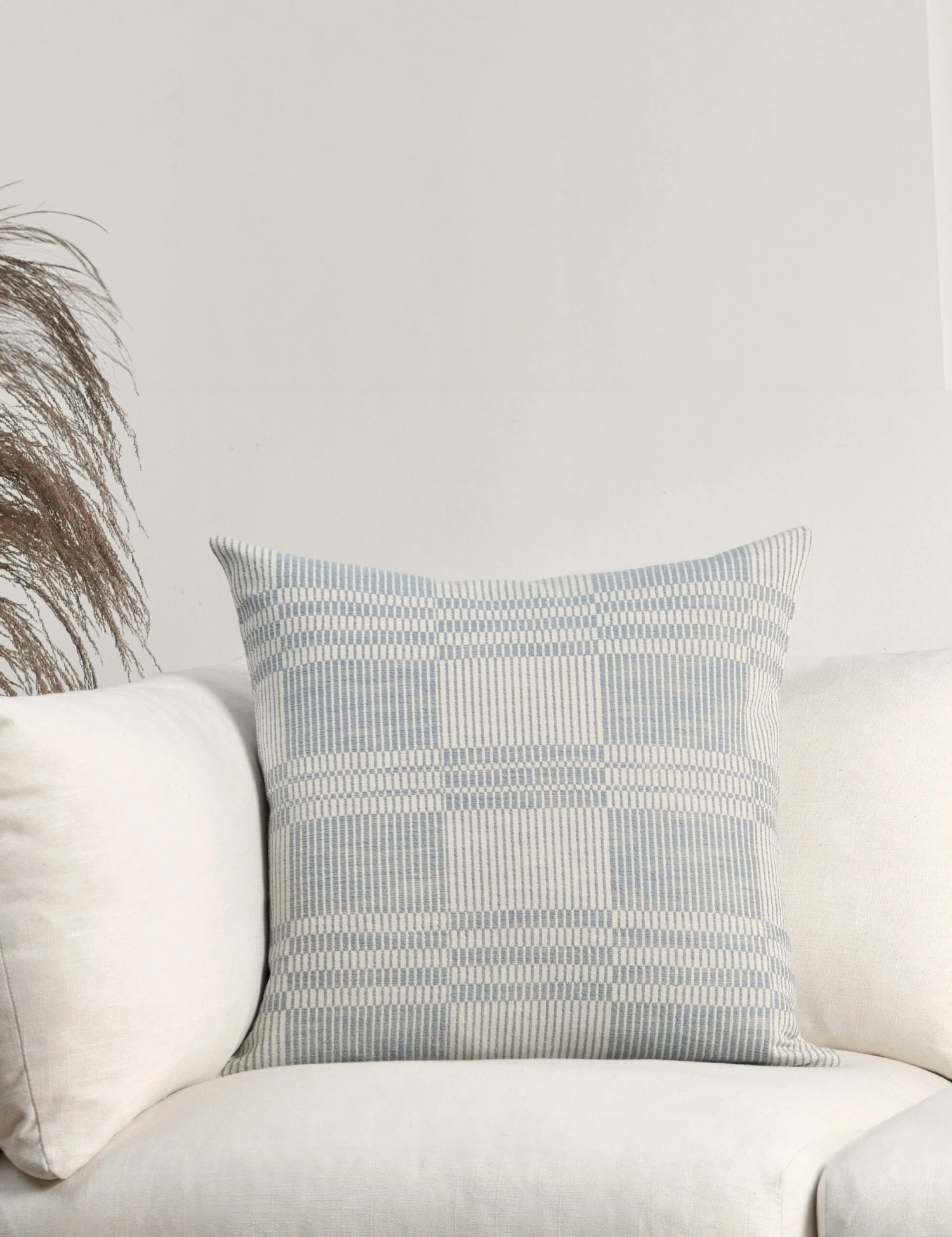 The Ellis throw pillow offers a modern look with transitional appeal. Its geometric weave offers visual interest in a dust blue colorway that folds into the room with an almost neutral tone that can play against warmer colors or greenery. Style this versatile accent pillow in a bedroom or lounge to bring the look together.