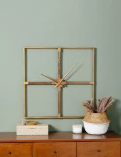 A unique square profile is finished in gold with strips of mahogany in this classically inspired clock design. Style this wall clock in a home office or transitional space for an accent that reflects and refreshes traditional design notes.