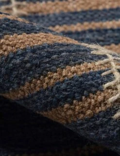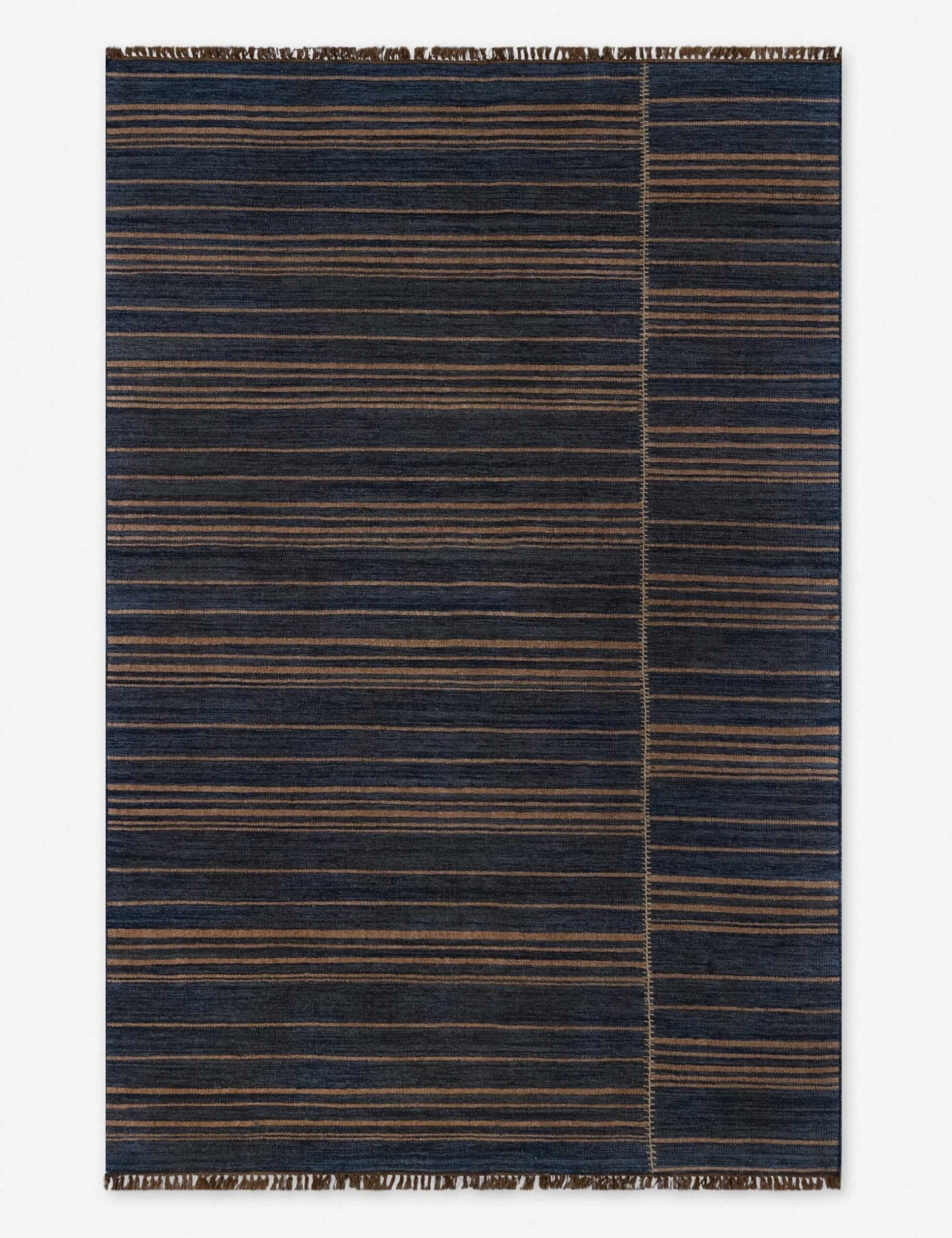 This handwoven area rug brings global inspiration to life with an asymmetrical stripe pattern and deep, rich hues. Knotted fringe and contrast stitching details make this living room rug a great piece for grounding your casual style.
