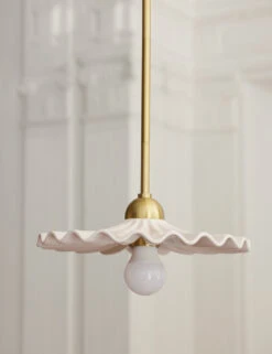 Refresh your lighting design with the delicate yet dynamic silhouette of the Madrona pendant. The ruffled form of the shade catches the light, offering sculptural contrast against the clean lines and polished luster of the antique brass finished fixture. You can hang this damp-rated pendant in your lounge, kitchen, or bathroom for a stunning overhead feature.