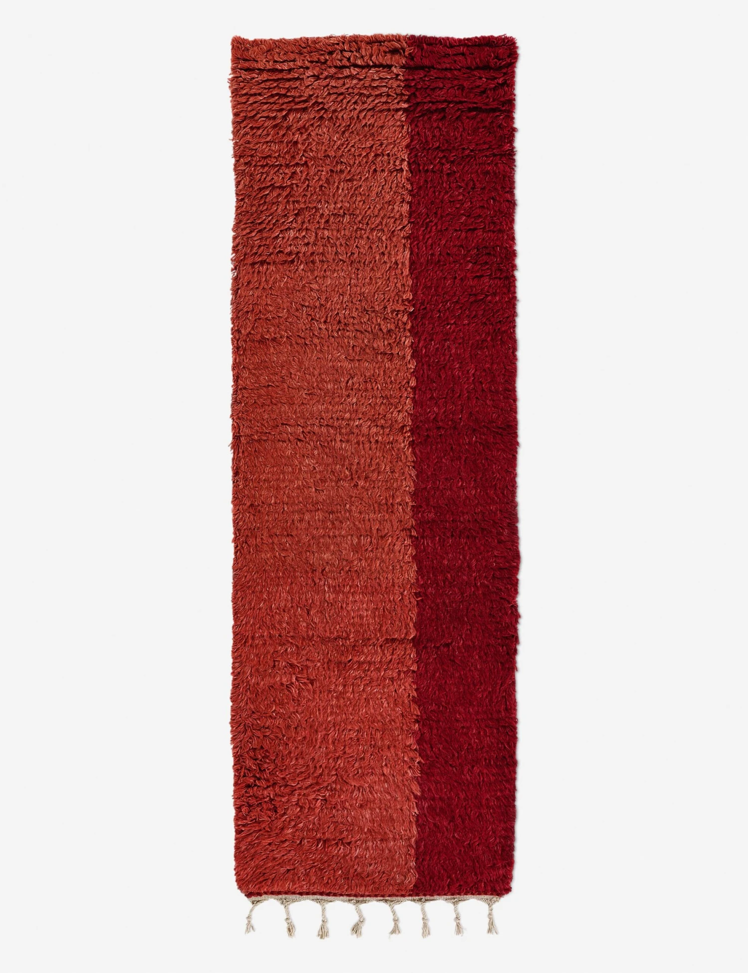Go for bold with this two-tone red rug. The handwoven construction provides a soft yet durable texture underfoot, ready to style throughout your home. With its plush wool pile and tassel trim, this versatile floor rug lays an inviting foundation for everyday elegance.